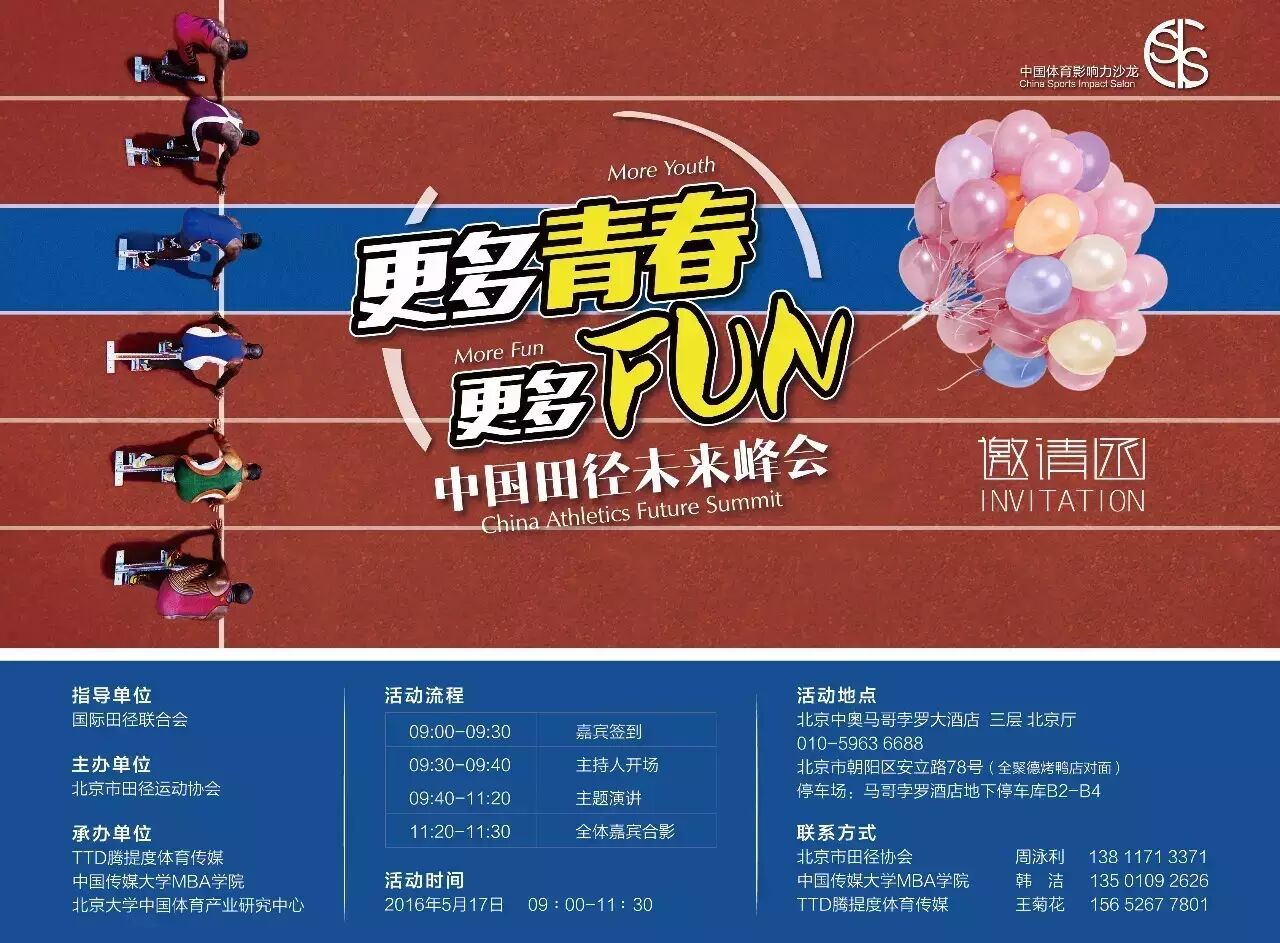 以“更多青春 更多FUN”为主题的中国田径未来峰会将于5月17日在北京中奥马哥孛罗大酒店隆重举行。本次峰会由北京市田径运动协会主办,由TTD腾提度体育传媒、中国传媒大学MBA学院、北京大学中国体育产业研究中心三方共同承办。届时中国田径未来峰会将会为整个田径行业带来哪些新的思考呢?又有哪些大咖莅临本次峰会呢?让我们拭目以待。