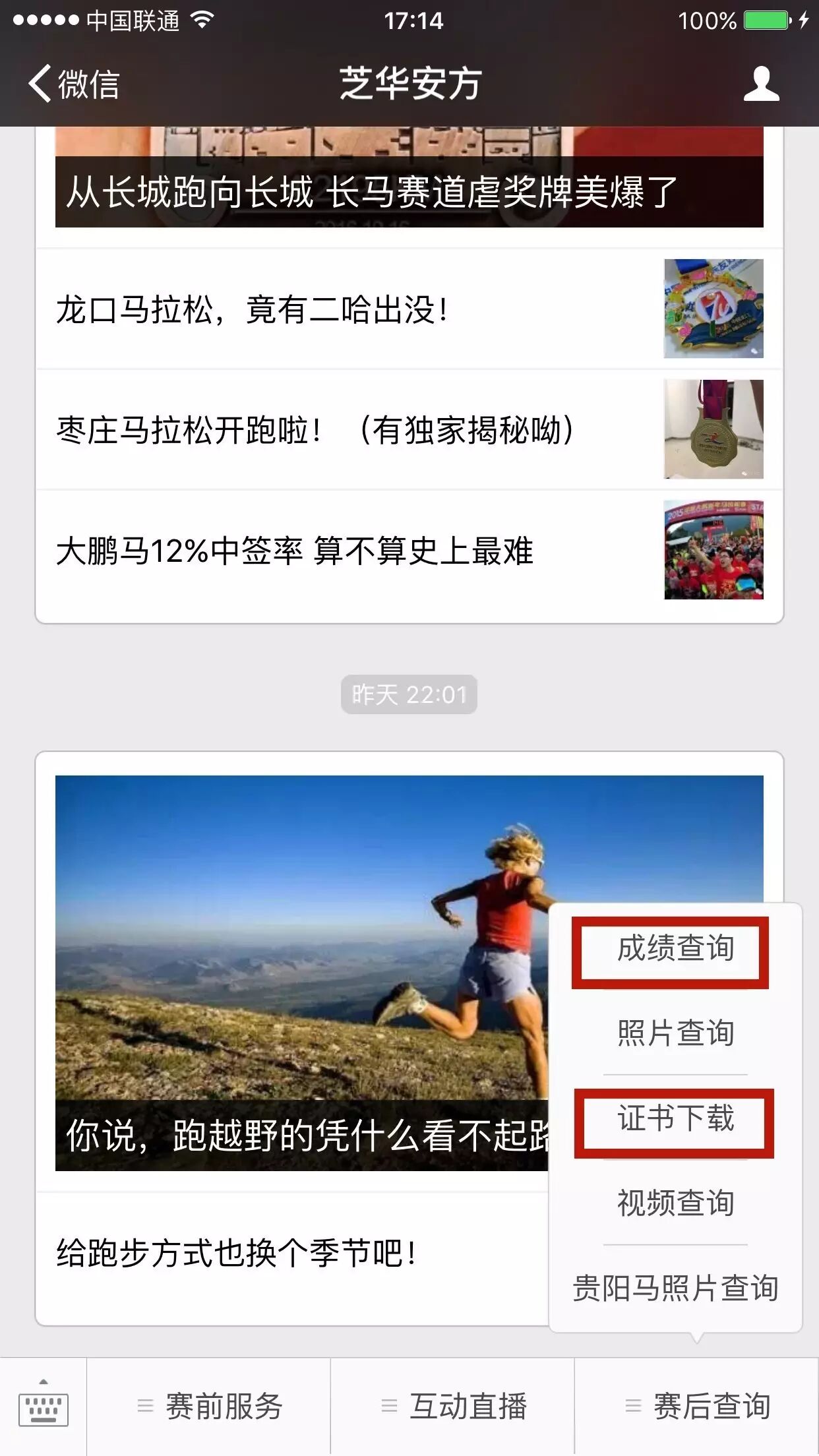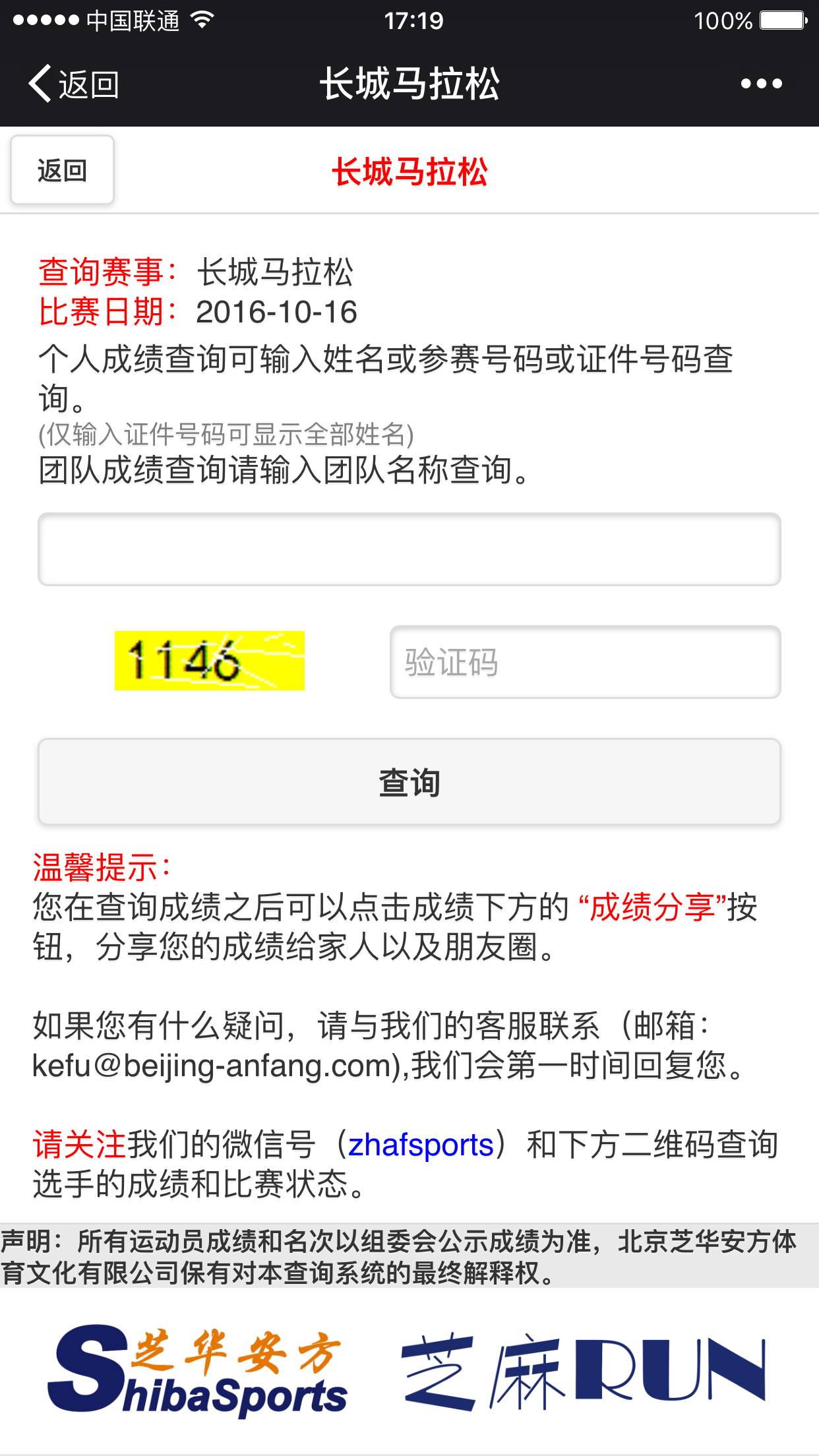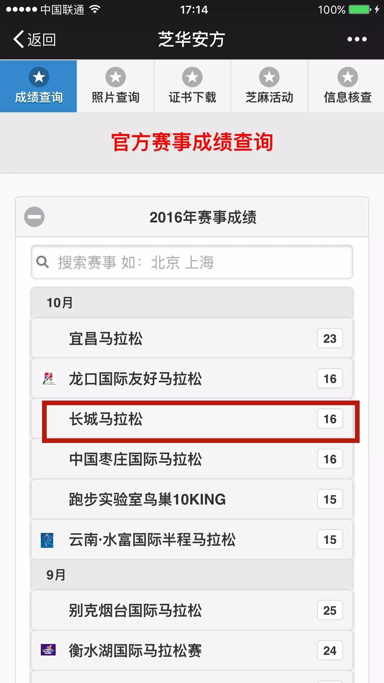 2016长城马拉松已经完美落幕。今天小编为大家带来成绩查询以及证书下载的攻略。关注芝华安方微信平台进入微信公众号点击菜单“赛后查询”中的“成绩查询”和“证书下载”点击“长城马拉松”按提示输入个人参赛号或证件号个人成绩、证书有了完赛证书,别忘了给小编晒一晒哦~2016长城马拉松合作媒体