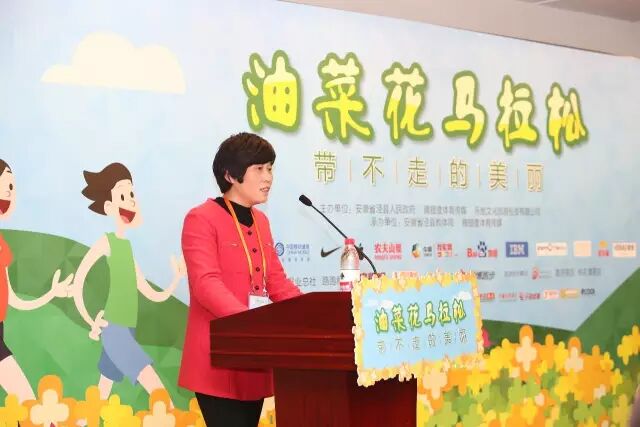 泾县人民政府副县长杜寿琴介绍油菜花马拉松赛的相关筹备情况