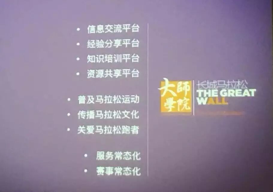 国内首个以全球知名地标长城命名的马拉松赛事—长城马拉松组委会今天在北京宣布,由长城马拉松赛事IP衍生出来的高端体验培训体系——长城马拉松大师学院,在经过了一年的磨砺后,终于以华丽丽的专业气质夺壳而出,惊动业界。