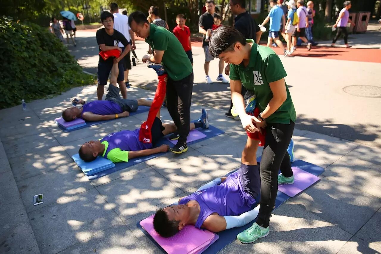 跑步结束后纳西亚动能健康俱乐部的专业教练带领跑者一起进行肌肉拉伸与放松训练,其专业而细致的按摩也得到了跑友们的一致夸赞。纳西亚是由Panacea音译而来,是希腊神话中治愈女神的名字,她通过手法去缓解、治愈人们身体上的痛苦,帮助人们获得健康,这也是纳西亚所要向大家普及的。