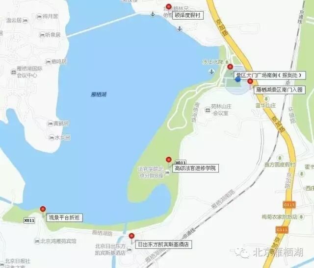 沿景区大门→环雁栖湖景区一圈出→高级法官进修学院→日出东方凯宾斯基酒店→观景平台折返→雁栖湖景区南门入园→景区大门→终点(全程约6公里,用时30分钟至60分钟)。