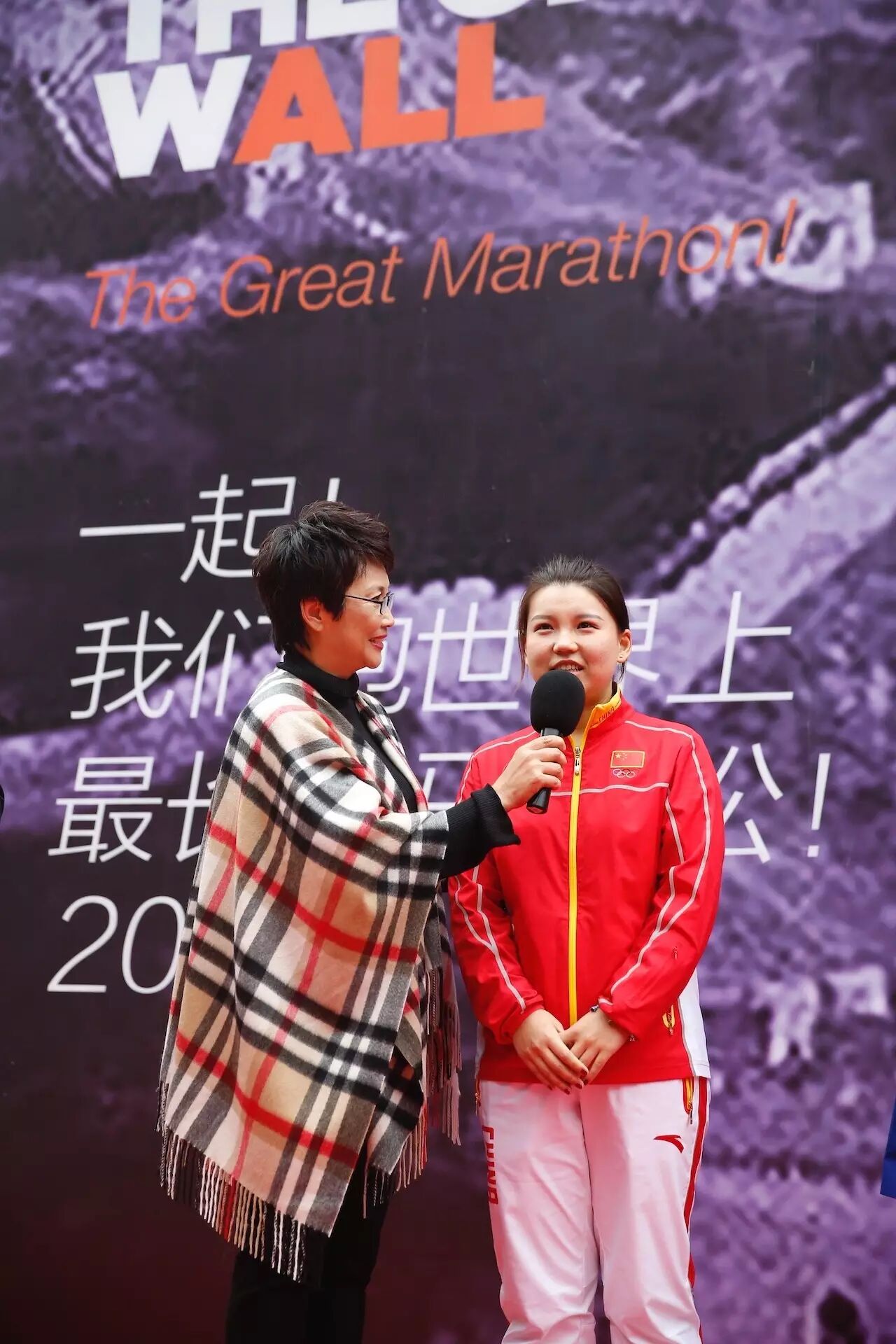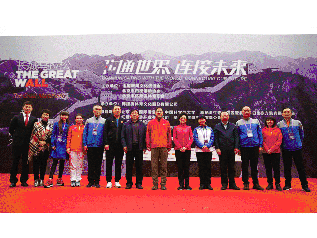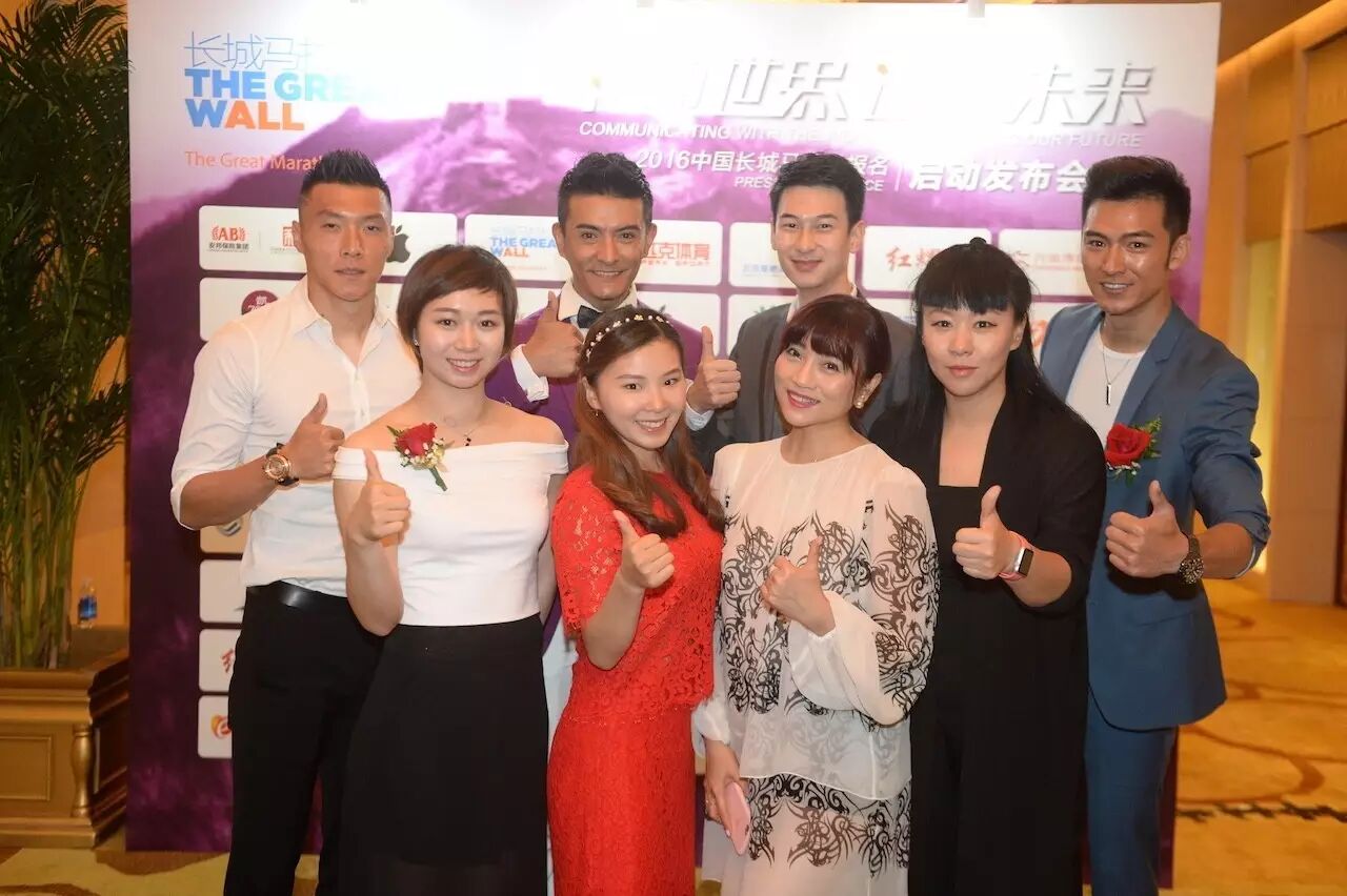 奥运游泳冠军钱红(前排右一)、体操奥运冠军杨伊琳(前排右三)、何可欣(前排右四)、足球运动员于大宝(后排左一)参加长城马拉松启动发布会