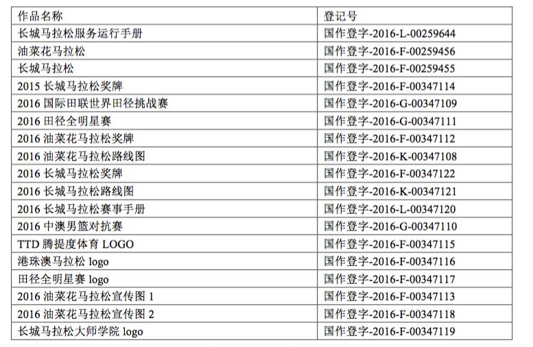 长城马拉松全程围绕着1300多年前建造的古长城而跑,是最具中国文化符号的国际赛事。腾提度体育充分认识到版权对于品牌保护的重要作用,2016年6月6日,在长城马拉松报名启动发布会上,中国版权保护中心党委书记邹建华向腾提度体育董事长苏玲颁发了中国长城马拉松版权作品证,由此正式确认了腾提度体育机构对长城马拉松版权的所有权。