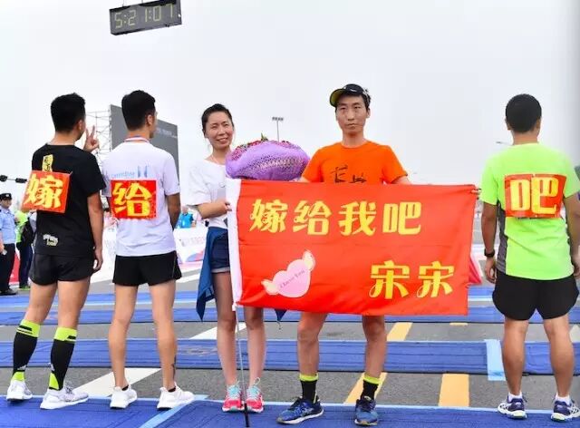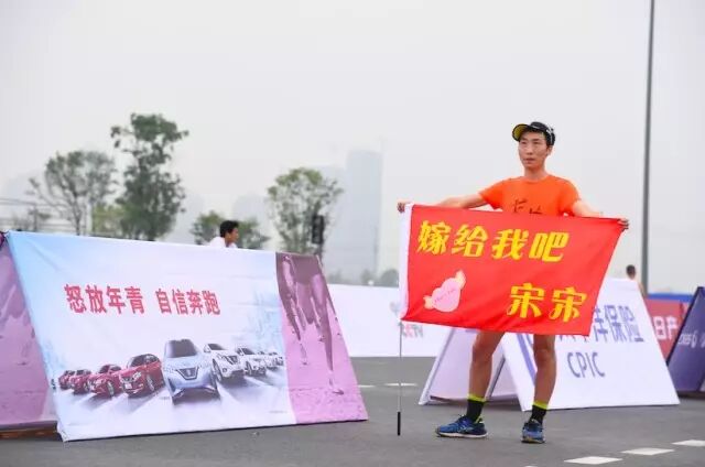 北京时间9月23日13点10分,在开跑枪响5小时10分钟后,东风日产2017成都国际马拉松赛全程42.195公里的终点线旁,一位即将完赛的全马选手突然举起双手拉起一面上面写着“嫁给我吧!宋宋”字样的旗帜,然后不紧不慢的走向终点线,静静地等待着5小时20分赛时的到来!这突如其来的行动让他与周围急于最后时间冲刺的选手显得格外与众不同,引来周围众多选手和观众的围观。