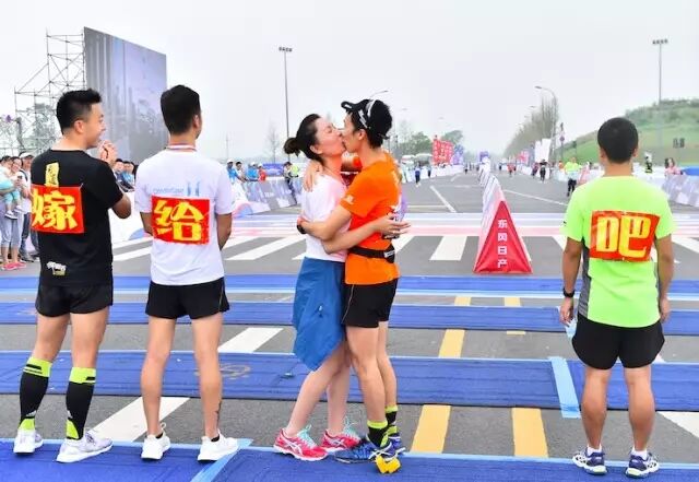 小伙子身旁的跑友转身背后打出“嫁给他”的字符让这样特殊的场边变得温馨浪漫,简直羡煞旁人。在成马的终点线上求婚,让成马有幸见证了一段也许只有在偶像剧中才出现过的戏码。作为女主角的宋宋姑娘因为激动和开心情忍不住的泪洒赛场,毫无疑问她是今天成马赛场最为幸福的人,或许没有之一!