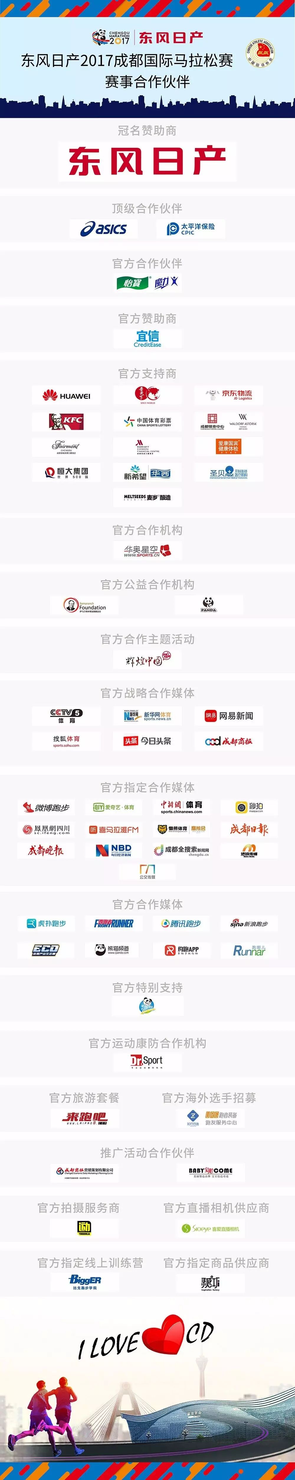 感谢赛事冠名赞助商东风日产对本次赛事的大力支持!同时感谢ASICS亚瑟士为跑友提供的专业运动享受,太平洋保险为赛事提供的安心保障,怡宝饮用水、魔力运动饮料的给力补给,宜信所提供的专业理财服务,和华为、香天下、京东物流、肯德基、中国体育彩票、成都银泰中心华尔道夫酒店、成都棕榈泉费尔蒙酒店、成都首座万豪酒店、爱康体检、新希望华西乳业、圣贝牙科、麦岁啤酒等各界企事业单位,以及新华网体育、网易新闻、搜狐体育、今日头条、成都商报等新闻媒体对赛事的鼎力支持。